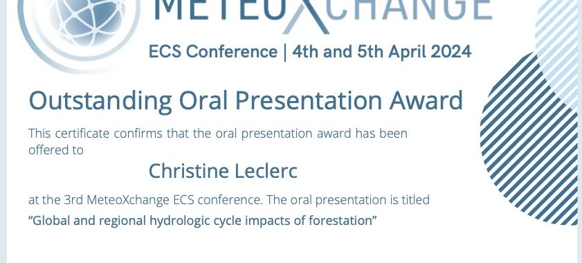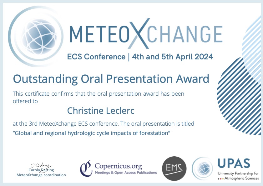 Congratulations to M.Sc. student, Christine Leclerc, who was awarded an Outstanding Oral Presentation Award at the 3rd MeteoXchange ECS Conference this year. Well done, Christine!